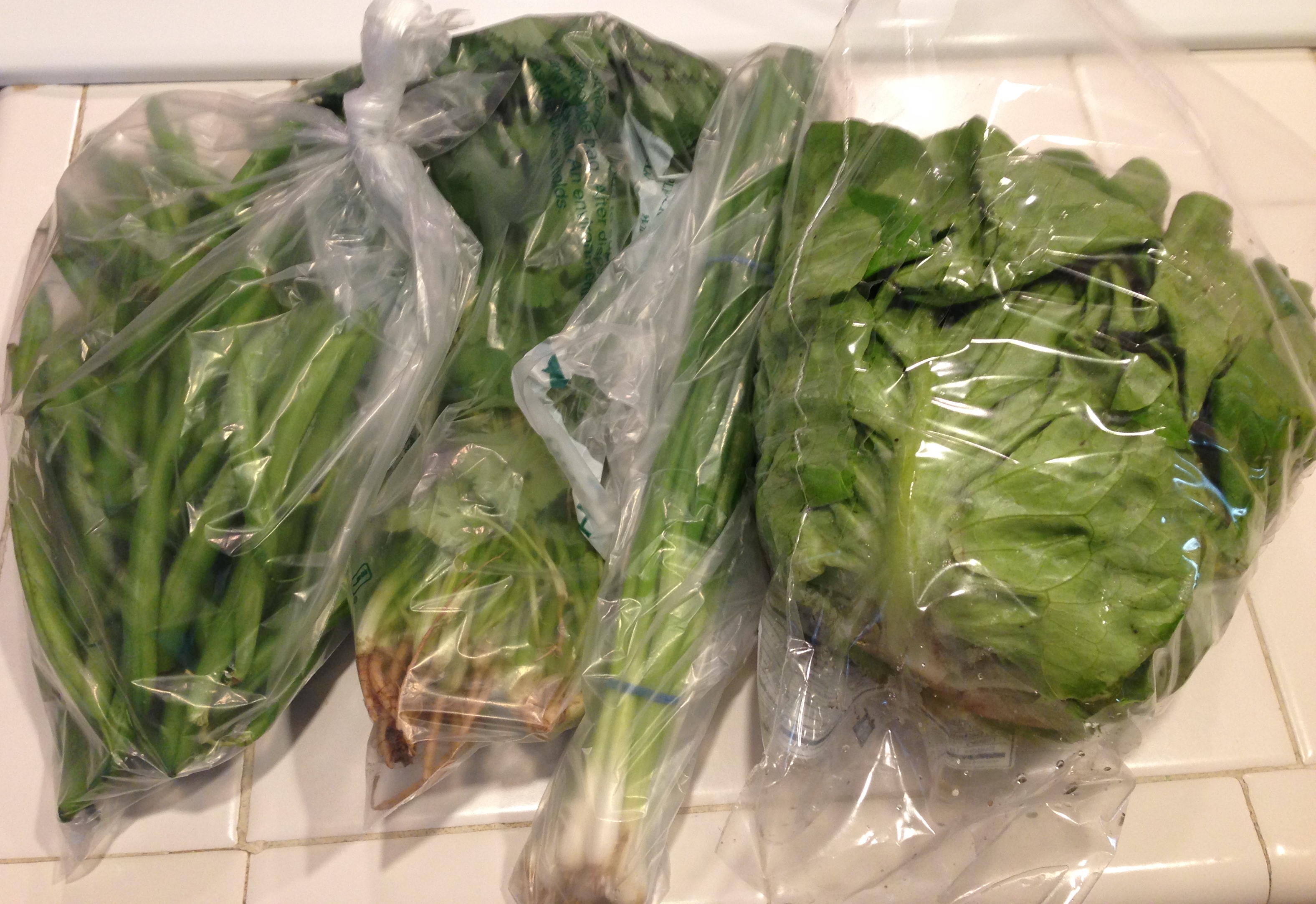 Here’s my most recent trip to the farm stand. Unfortunately we’re moving out of season (we’re not big winter squash eaters) so all we got was green beans, cilantro, scallions, and lettuce.