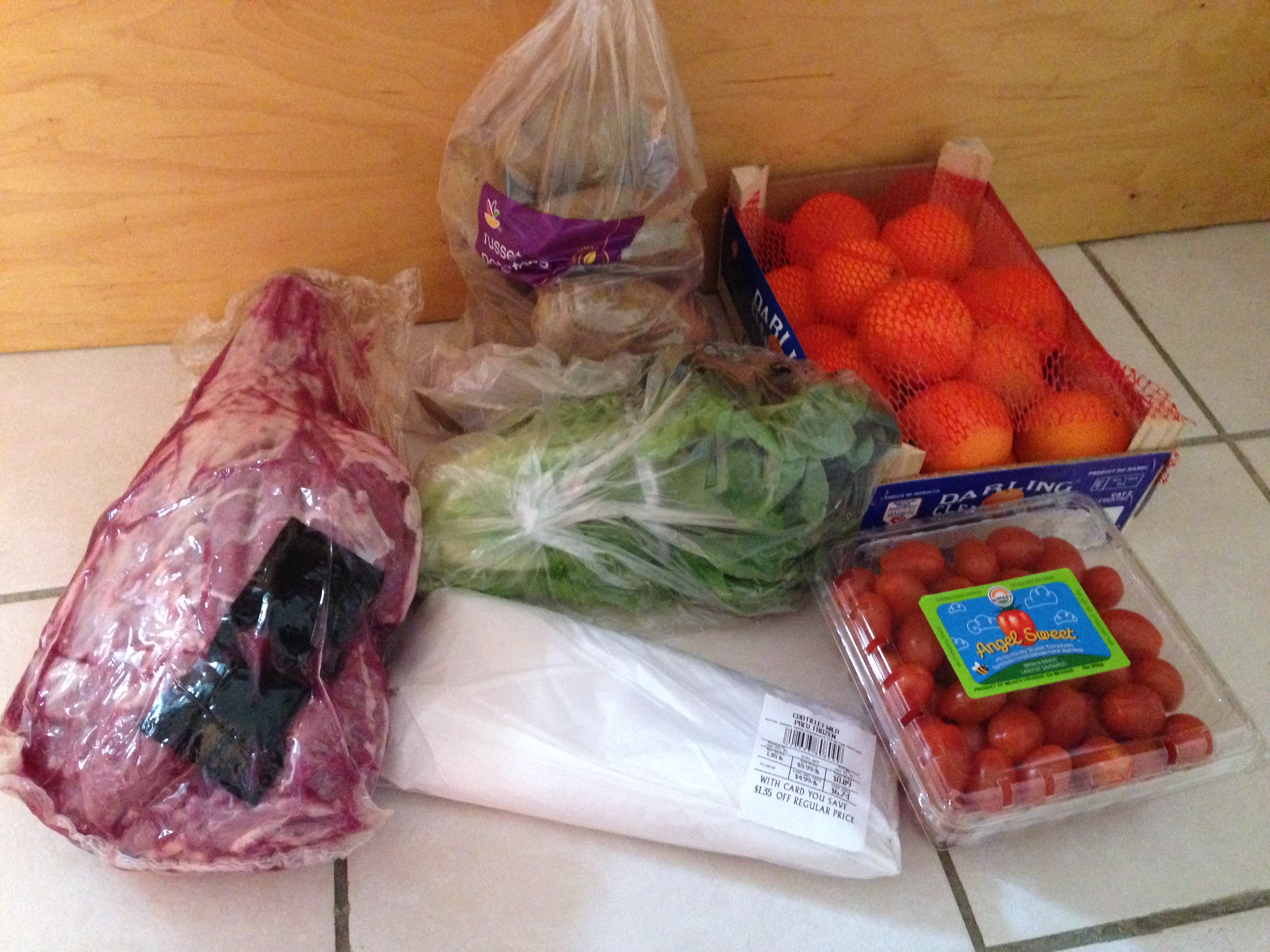 The lamb was obviously the big ticket item, on a great sale. It might be hard to tell but the white block in front is wrapped fish (cod) and there’s a bag of lettuce.