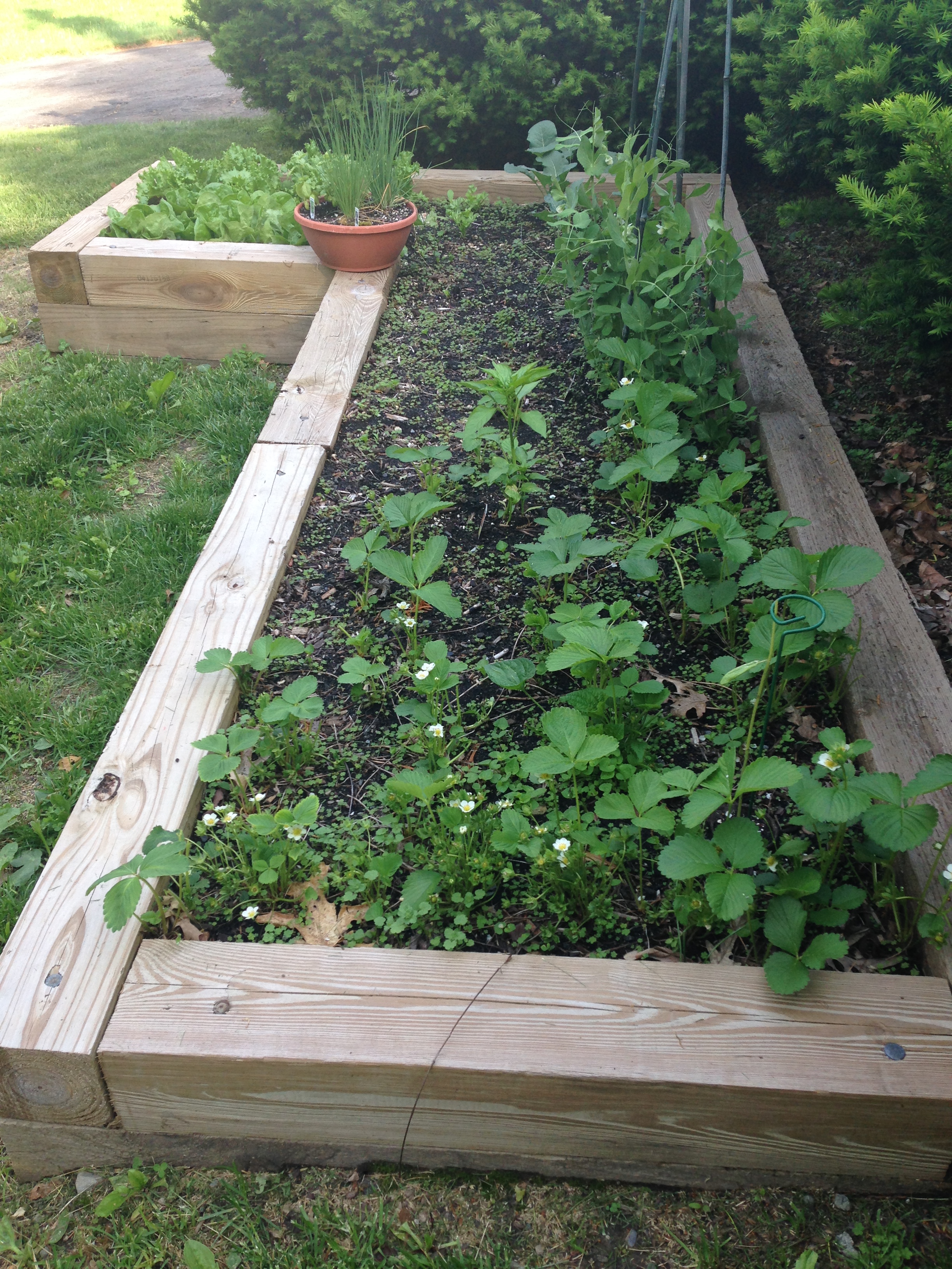 The garden has been doing well. We have lots of flowers on our strawberry plants. The peas are growing nicely. The broccoli and celery may have recovered from being taken down to nubs by some animal overnight.