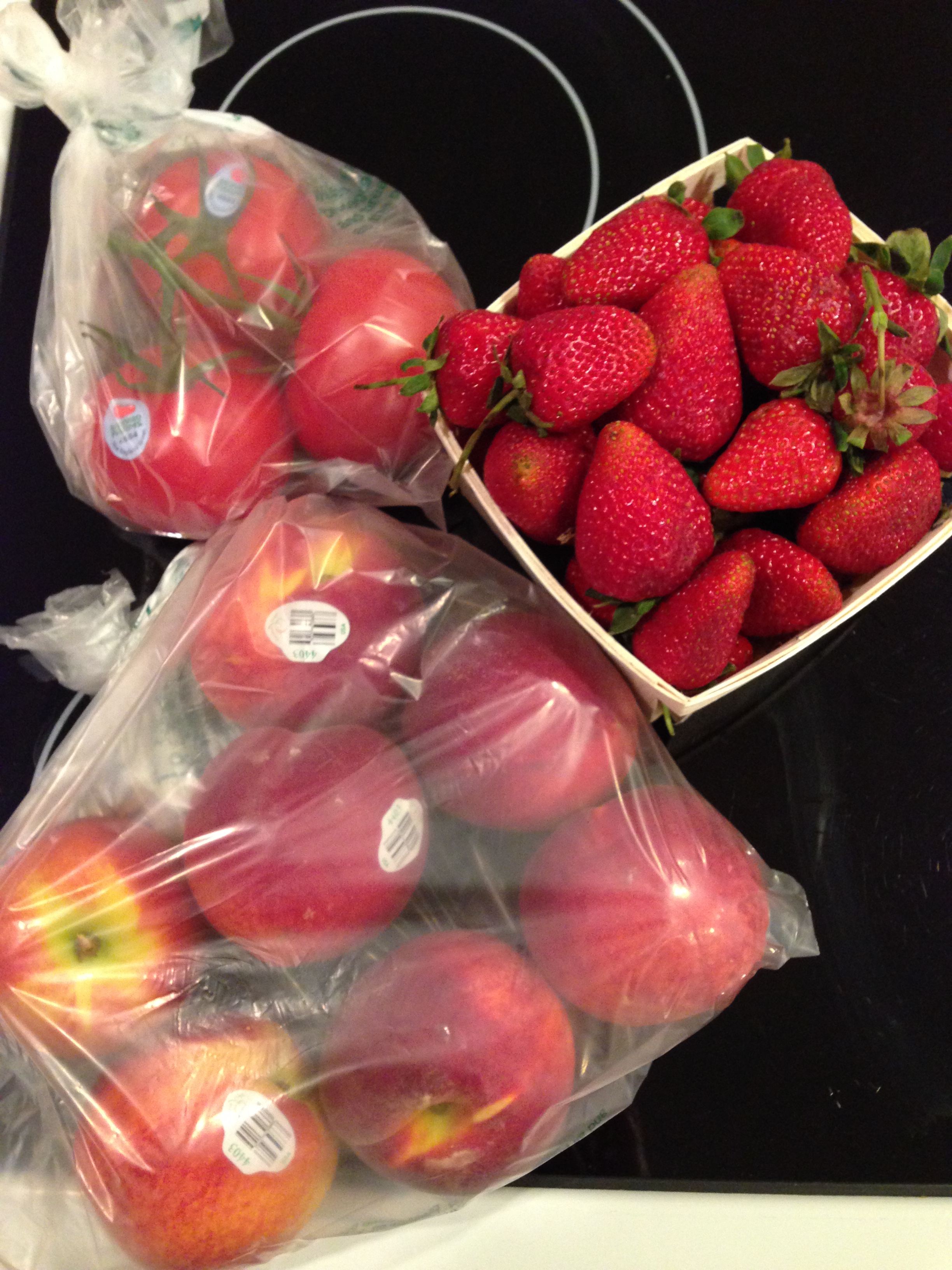 On Wednesday I also stopped at Trader Joe’s for three boxes of cereal bars (didn’t take a picture of them). And, I went to the local produce place. There I got strawberries, tomatoes, and peaches. They buy from all over so none of these are actually local yet. The local produce here now is limited to greens, but strawberries are expected in 1-2 weeks. Yippee!