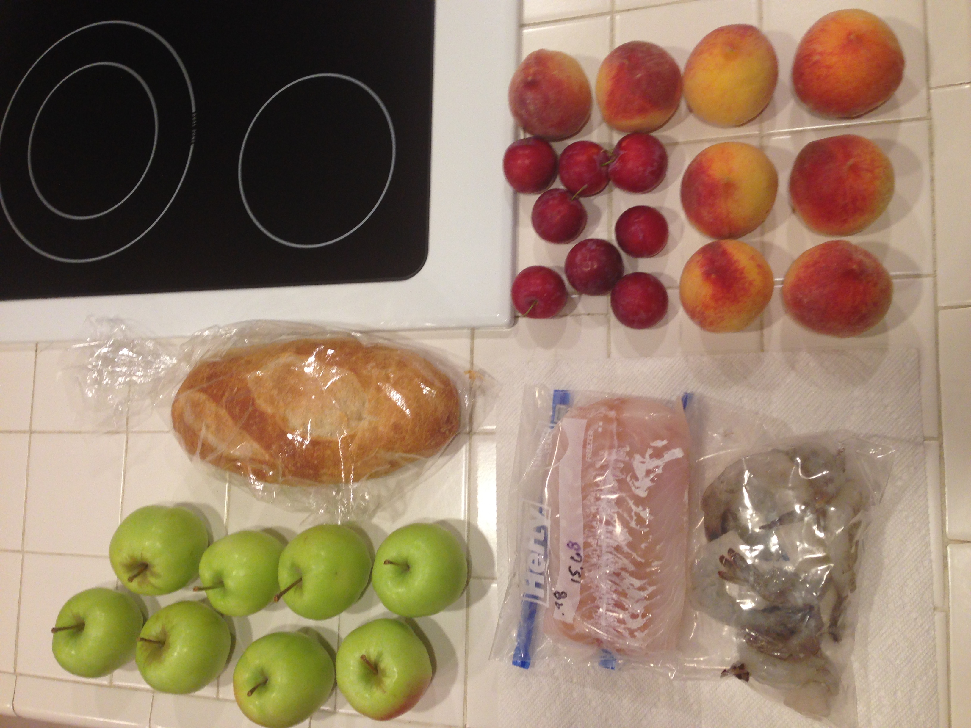 First, I went to the farmer’s market. We got peaches, plums, and apples. The plastic bags hold cod and shrimp (frozen, not local) with which I made California Fish Stew that was served with the loaf of bread for dinner.
